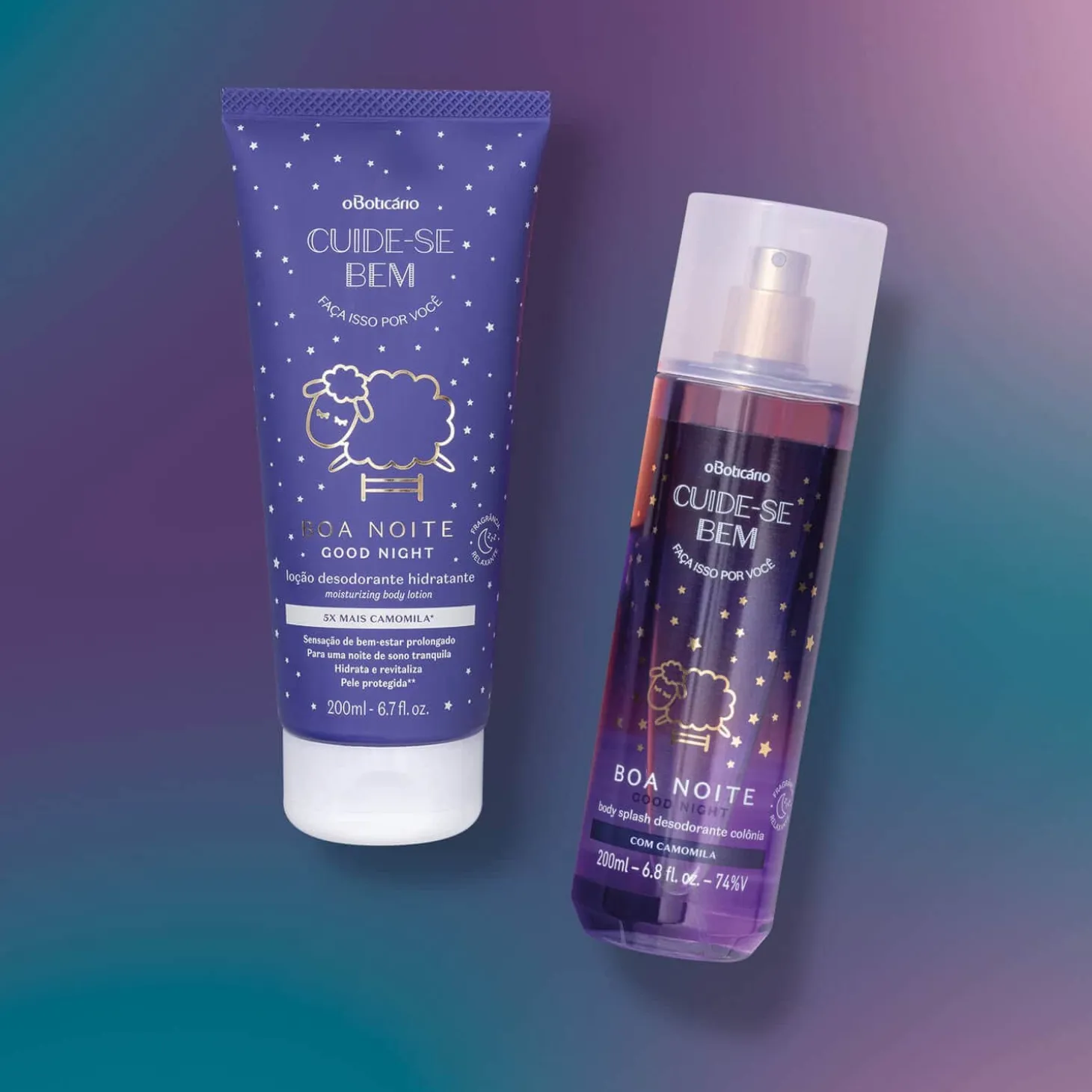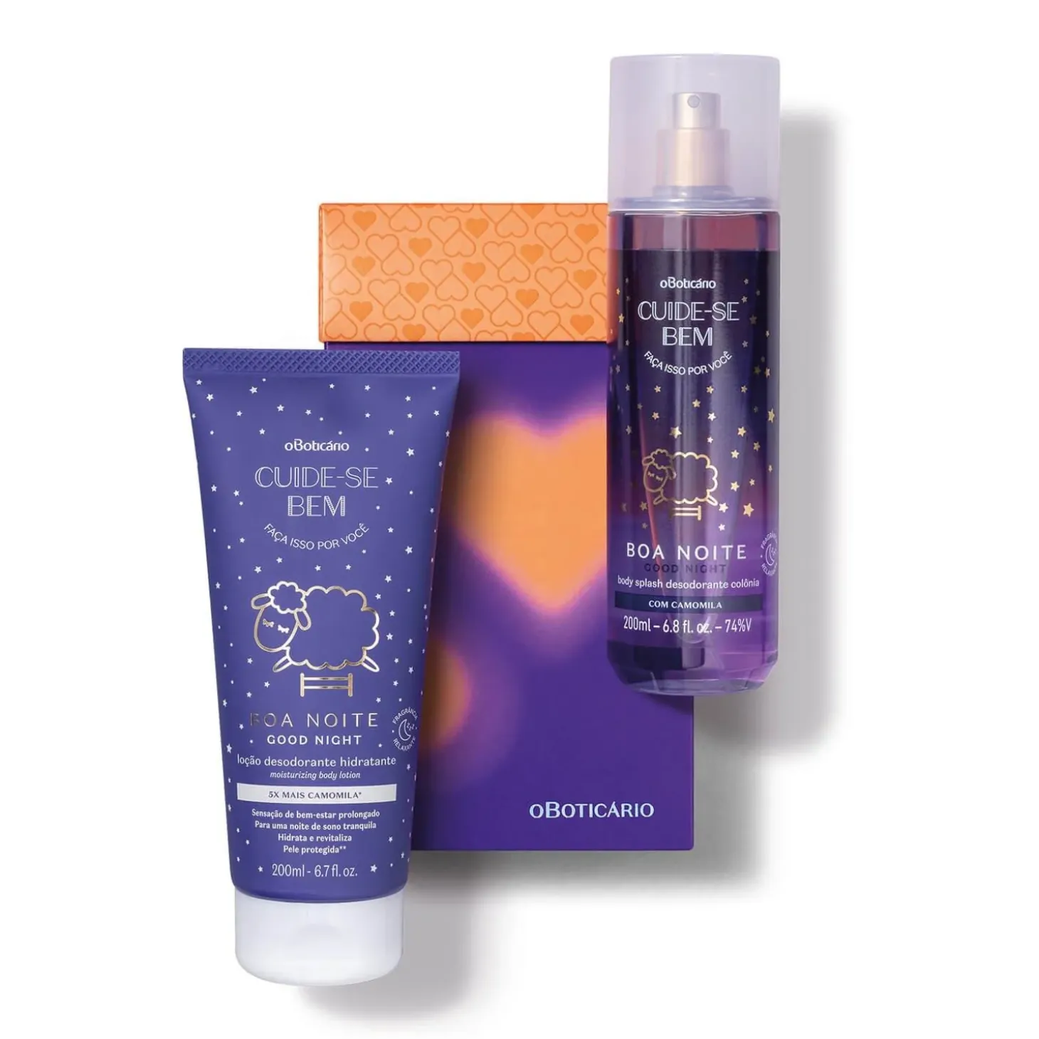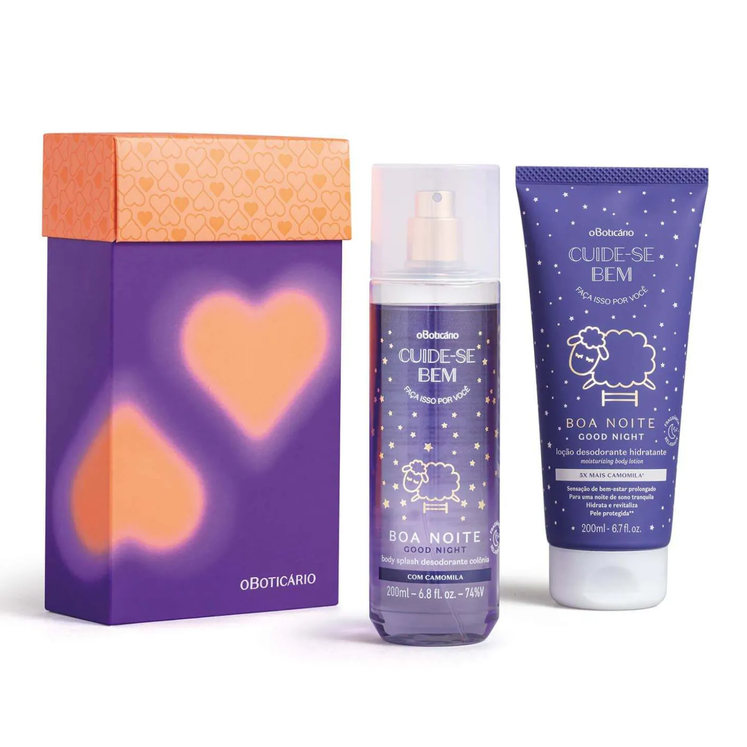 Kit de Regalo – Cuide-Se Bem Boa Noite (2 artículos)Este kit estará presente en uno de los mejores lugares del mundo: en los sueños de la persona amada. Con dos artículos de cuidado personal que brindan una sensación de confort con una suave fragancia, este kit le recordará a esa persona que decir, es el mejor de los regalos.BODY SPLASH 200ML – CUIDE-SE BEM BOA NOITEEs el artículo ideal para quienes no renuncian a perfumarse ni siquiera a la hora de dormir. Es la unión de la perfumería con una sensación de confort indescriptible. Con ingredientes que promueven la relajación, este body splash tiene una suave fragancia Floral Almizcle y puede usarse en todo el cuerpo.CREMA HIDRATANTE CORPORAL 200ML – CUIDE-SE BEM BOA NOITEAporta una textura confortable que hidrata profundamente la piel y le aporta suavidad, dejándola renovada. Su fórmula desarrollada con 5 veces más Manzanilla proporciona una sensación de bienestar, haciendo que las noches de sueño sean más especiales.Este kit contiene:01 Body Splash 200ml – Cuide-Se Bem Boa Noite01 Crema Hidratante Corporal 200ml – Cuide-Se Bem Boa NoiteNingún producto de OBoticário es testado en animales, es decir, estos artículos tienen el sello Cruelty Free.